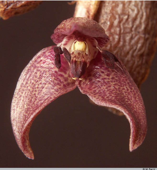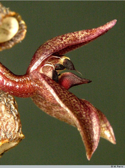 Found only in western Papua New Guinea with a stiffly patent rhizome [unique to the section], with .88" [2.2 cm] between each, ellipsoid to ovoid pseudobulb carrying a single, apical, ovate, acute, dark green, slightly suffused with purple, abaxially glabrous, petiolate base leaf that blooms on a short, single flowered inflorescence.