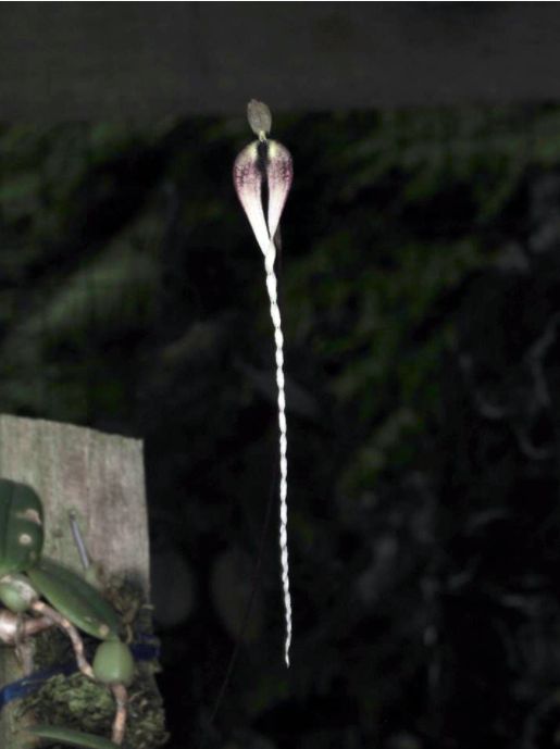 Found in western New Guinea without locational data as a mini-miniature sized, warm to cool growing epiphyte with a short-creeping rhizome provided with not persistent sheaths and giving rise to erect; , .24 to .64" [.6 to 1.6 cm] between each, ovoid to ellipsoid to c. globose, obtusely 3 to 4 angled in cross section pseudobulbs carrying a single, apical, erect, elliptic to elliptic-ovate, rounded apex, petiolate base leaf that blooms in the spring on an erect, peduncle c. 6" [15 cm] long, provided with 4 scales, rachis c. 1.2" [3 cm] long, single flowered inflorescence with much shorter than the ovary floral bracts.