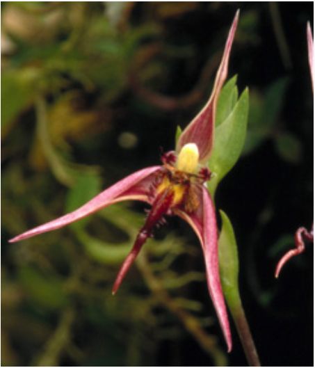NOTICE Even though the photo above is not that great it has an important detail that is diagnostic to the flower in question. To the right of the flower and going off to the right side of the photo can be seen a partial side view of the lip, compare that to the TYPE drawing by Schlechter of the flower in the top center showing his side angle draqwing of the lip.