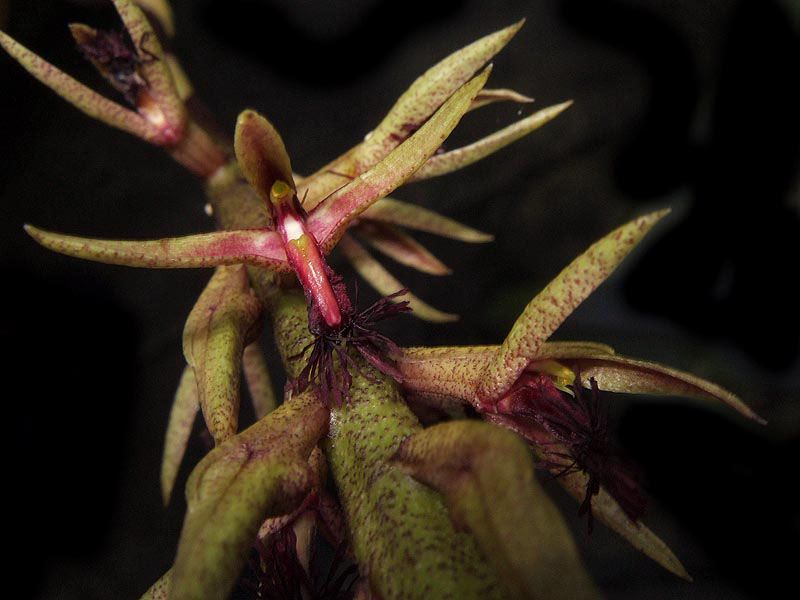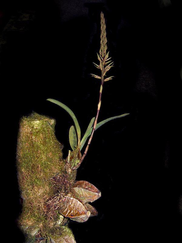 Found in southeastern Madagascar in humid evergreen forests at elevations of 1100 to 1800 meters as a small sized, warm to cool growing epiphyte with an ovoid, 4 angled, brick red pseudobulbs carrying 2 apical, oblong, shortly contracted towards the base leaves that blooms in the spring on a basal, 4.8 to 10" [12 to 25 cm] long, slightly verrucose, loosely 12 to 20 flowered inflorescence enveloped basally by a few large, loose sheaths and has narrowly lanceolate, acute, single veined floral bracts.