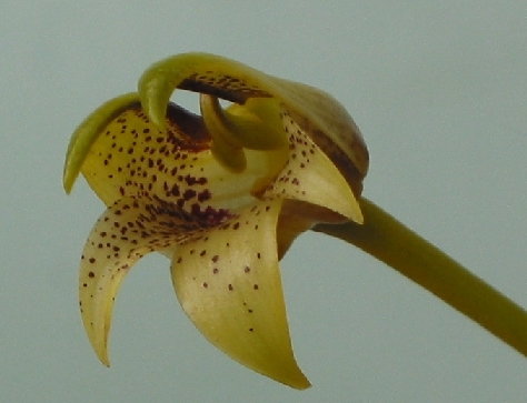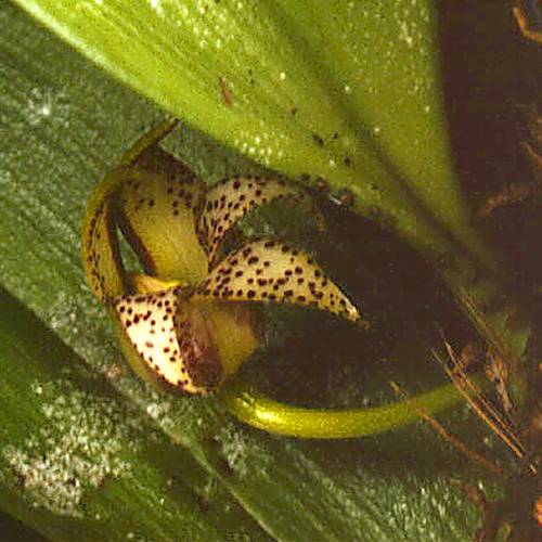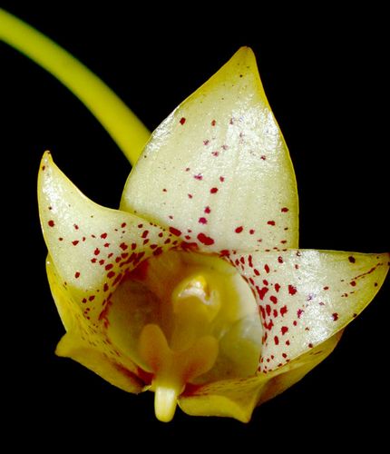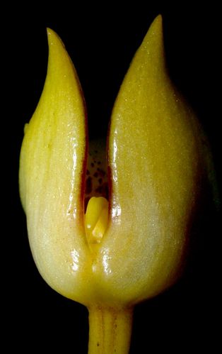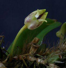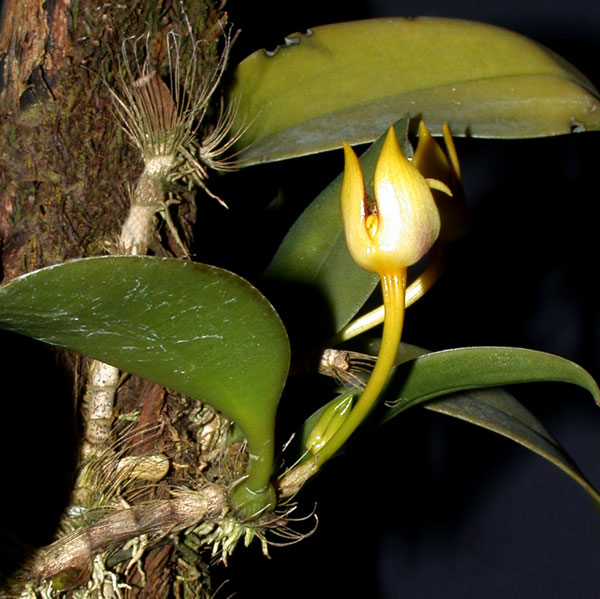 Found in Papua and New Guinea and the Philippines on tree trunks in dense forests at elevations of 100 to 400 meters as a small sized, hot growing, unifoliate epiphyte with [8 to 10 cm] between each, globose pseudobulb and carrying a single, apical, elliptic-oblong, rigid leaf that blooms in the spring on an erect, slender, 1 5/8" to 2 3/4" [4 to 7 cm] long inflorescence with 3 yellow sheathing bracts, giving rise to a single, fragrant [sweet], non-resupinate, waxy flower.