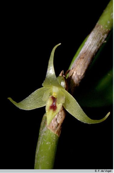 Found in New Guinea and the Solomon Islands in lower range forests at elevations around sea level to 1200 meters as a small to medium sized, hot to cool growing epiphyte with cylindrical, connate to the rhizome pseudobulbs carrying a single, apical, erect, linear-ligulate, acute, distinctly attenuate below into the base leaf that blooms in the late fall and early winter on a very short few bracted, single flowered inflorescence with very small, slightly more than half as long as the ovary floral bracts.