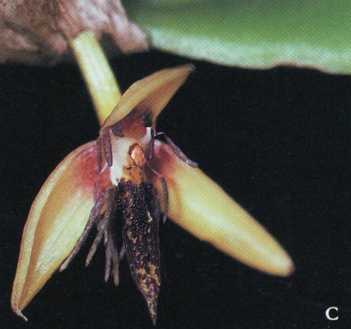 Found in Myanmar, Java, Sumatra, Borneo and the Moluccas in lowland and open podozol forests at elevations around 400 meters as a miniature sized, hot growing epiphyte with a hanging rhizome with .6" [1.5 cm] between each ovoid, somewhat flattened pseudobulb carrying a single, apical, thick, elliptic, medium green, petiolate base leaf that blooms in the winter, late spring and early summer on an erect, .72" [1.8 cm] long overall, peduncle .34" [.35 cm] long, single flowered inflorescence with tubular, much shorter than the ovary floral bracts and carrying non-fragrant flowers with yellowish sepals suffused with red purple or purplish brown near the base, white petals, whitish appendages very finely spotted with purple, and an entirely dark purple or green lip with very dark purple blotches that is abaxially white near the base.