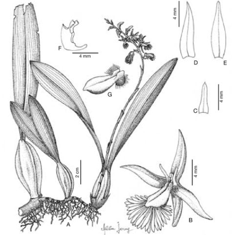 Found in east northeast Madagascar in mid elevations rainflorests at elevations of 900 to 1100 meters as a miniature to small sized, warm to cool growing epiphyte with 1.2" [3 cm] betweeen each tetragonal, ovoid, purple red pseudobulbs carrying 2 apical, oblong, flat, coriaceous, obtuse apically, long-attenute into the pseudopetiolate base leaves that blooms in the spring on an erect, slender, longer than the leaf, peduncle 4.8 to 5.2" [12 to 13 cm] long, provided with 5 to 6 truncate, cauline sheaths, rachis 3.2 to 3.6 [8 to 9 cm] long, fleshy, glabrous, slightly thicker than the peduncle, successively few, 13 or so flowered inflorescence with narrowly oval, acute, single nerved, longer than the ovary floral bracts.
