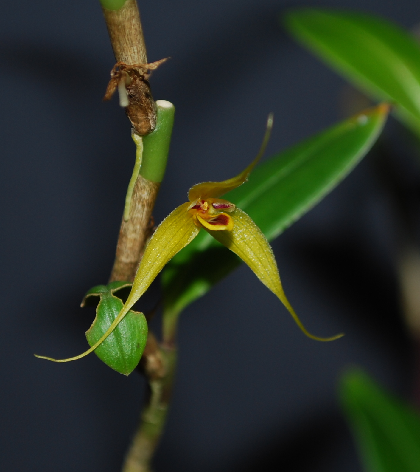 Found in Papua New Guinea in upper montane forest with scattered Araucaria at elevations of 2100 to 2300 meters as a small to medium szied, cool growing epiphyte with [.7 to 1.5 cm] between each porrect, distant, cylindrical-obovoid pseudobulb with the next growth arising from the apex of the old pseudobulb and carrying a single, apcial, erect, elliptic, acute, gradually narrowing below into the petiolate base leaf that blooms on a basal, 1.2" [3 cm] long, single flowered inflorescence with 2 bracts and a tubular, acute floral bract and carrying widely opening flowers.