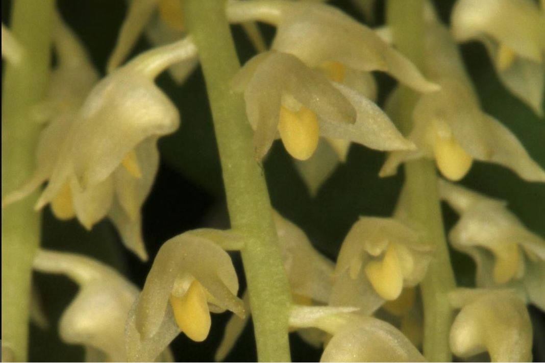 Found in the Philippines at elevations around 2000 meters as a mini-miniature to miniature sized, cool to cold growing epiphyte with .6" [1.5 cm] between each single, erect, leathery, oblong, grooved, rigid, petiolate base leaf that blooms in the spring and fall on slender, erect then bent, rachis to 4" [`0 cm] long, 10" [25 cm] long, loosely many flowered inflorescence with pale yellow flowers.