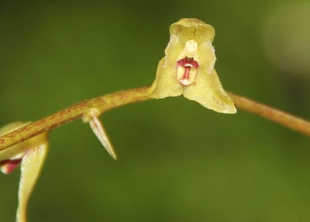 Found in China, eastern Himalayas and Myanmar in open montane forests at elevations around 2000 to 2500 meters as a miniature sized, cool to cold growing epiphyte with clustered, cylindrical, grooved pseudobulbs that widen slightly towards the base and are enveloped partially by imbricating sheaths and carrying a single, oblong-elliptic to lanceolate, acute, narrowing to a channeled, shortly petiolate to subsessile base leaf that blooms in the summer on a basal, glabrous, 19 to 35" [32.5 to 85 cm] long, slender, racemose, laxly 10 to 20 flowered inflorescence with basally clasping, spreading above, lanceolate, subacute, linear-lanceolate, acute floral bracts