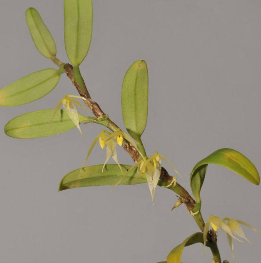Found Papua New Guinea in lower montane forests at elevations of 1200 to 1300 meters as a small sized, cool growing epiphyte with close set, porrect, cylindrical pseudobulbs arising from near the apex of the previous and carrying a single, apical, elliptic, subacute, gradually narrowing below into the shortly petiolate base leaf that blooms in the fall on a basal, porrect, to .8" [2 cm] long, single flowered inflorescence with a tubular, acute floral bract.