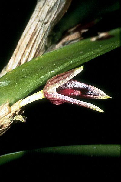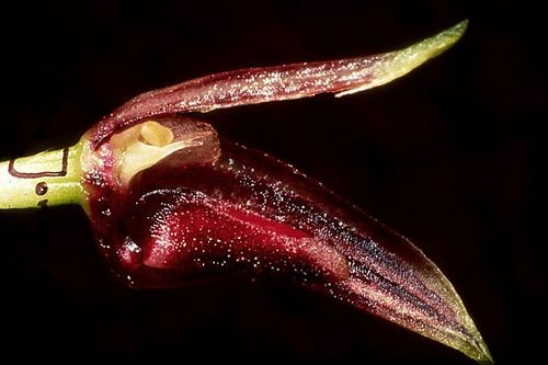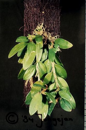 Found in New Guinea on trees in forests at elevations around 1300 meters as a small sized, cool growing epiphyte with a stem-like rhizome giving rise to close set, subparallel to the rhizome pseudobulbs carrying a single, apical, elliptic-ligulate, minutely apiculate leaf that blooms in the winter on a very short, fasciculate, provided with a few small bracts, single flowered inflorescence with very small, much shorter than the ovary floral bracts.