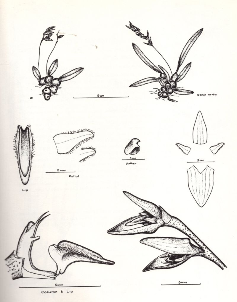 Found in northeastern Venezuela in montane cloud forests at elevations around 1500 meters as a mini-miniature sized, cool growing epiphyte with clustered, ovoid pseudobulbs carrying a single, apical, coriaceous, sessile, lanceolate, canaliculate base leaf that blooms in the fall on a basal, erect to arching, to 2" [5 cm] long overall, peduncle .8 to 1.2" [2 to 3 cm] long, rachis .8 to 1.2" [2 to 3 cm] long, successively 1 to 2, 3 to 5 flowered inflorescence with broadly lanceolate, as long as the ovary floral bracts and carrying distichous, dark red brown flowers with a dark red brown lip with the underside white baslly.