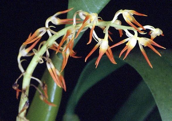 Found in Penninsular Malaysia and Borneo in hill forests at elevations around 520 to 600 meters on limestone as a small sized, warm growing, lithophytic orchid with a stout, long-creeping rhizome with 1" to 2 3/8" [3 to 6 cm] between each basally oblique and curved upwards, slightly flattened, apically narrowed pseudobulb which carries a single apical, oblong, apically rounded, basally petiolate leaf that blooms in the late summer and early fall on a sheathed, basal, 2 to 6" [5 to 15 cm] long, several flowered inflorescence with distichous, drooping flowers.