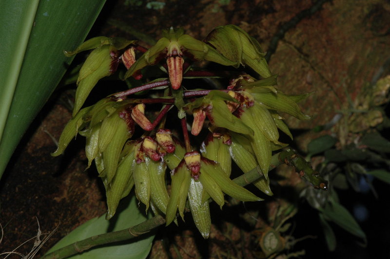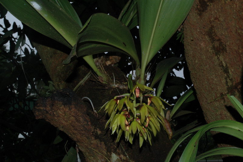 Found in Papua and New Guinea as a large, hot to warm growing epiphyte, lithophyte or terrestrial of forested hill country, usually on trees trunks but also on rocks and the ground at elevations of 400 to 1000 meters with oblong-cylindrical pseudobulbs held 6 to 8" [15 to 20 cm] apart carrying a single apical, erect, elliptic, acuminate and narrowed basally leaf that blooms at most any time of the year on a basal, 12 to 18" [30 to 45 cm] long, bracteate, stout, campanulate, few to several [18] flowered inflorescence with ovate, acuminate, shorter than the ovary floral bracts and carrying nodding, non-resupinate, not opening well, stinking flowers confined to the apex of the spike.