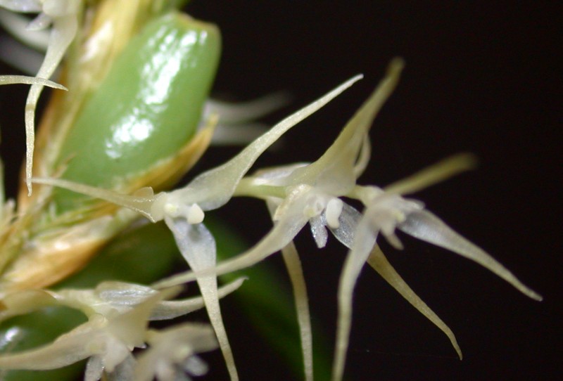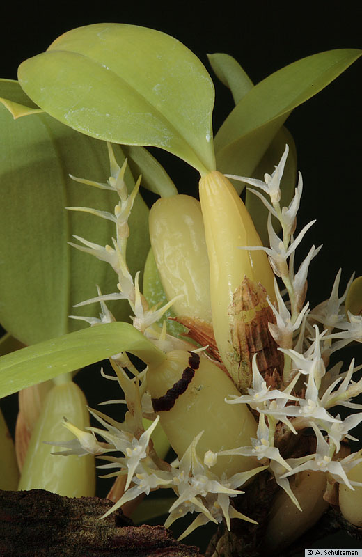 Found in Papua and New Guinea and the Solomon Islands,occurs at elevations of sealevel to 2000 meters on high branches of large rainforest trees as a large sized, hot to cool growing epiphytic plant with a descending growth habit and with a woody, sheathed rhizome carrying narrowly ovoid to ellipsoid, smooth in youth and wrinkled with age pseudobulbs that are pressed against the rhizome for half their length and then curving away and carrying a single, apical, descending to suberect, ovate, lanceolate or linear, thin, glossy dark green, acute leaf with several raised veins on the upperside that blooms in the spring through fall on a basal, lateral, fractiflex, 2 1/2" [3 cm] long, racemose, few [8] flowered inflorescence that are shorter than the leaves.