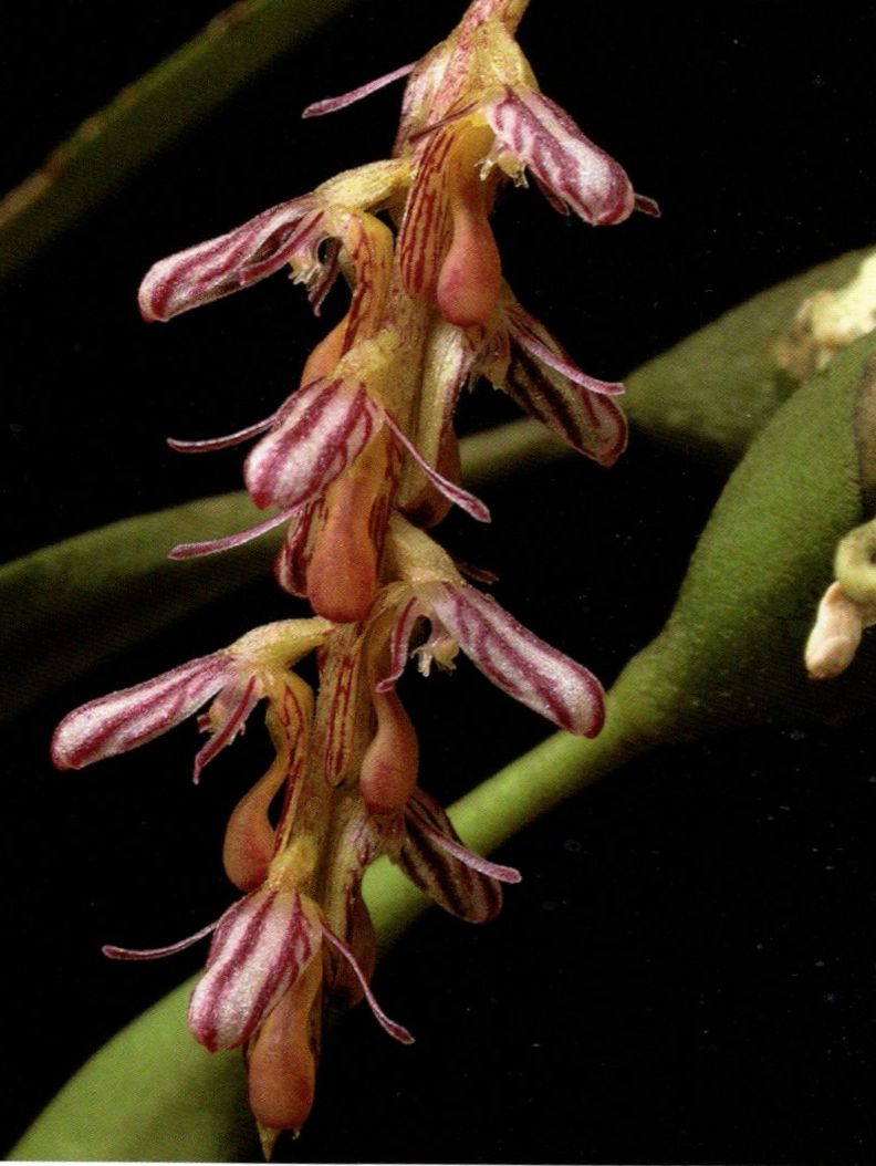 Found in Sulawesi in montane forest on steep slopes at elevations of 1100 to 1200 meters as a mini-miniature sized, cool growing epiphyte with a creeping rhizome enveloped by not persistent rhizome scales with .24 to .6" [.6 to 1.5 cm] between each slightly distant, ovoid, only slightly and obtusely angular pseudobulbs carrying a single, apical, erect, elliptic, acute, petiolate base leaf that blooms at most any time of the year on an an erect to patent, peduncle 1 to 2.2" [2.5 to 5.5 cm] long, provided with about 3 bracts 3, the longest .22 to .34" [5.5 to 8.5 mm] long. rhachis nodding at the base, pendulous, not thickened, 1.2 to 2.2" [3 to 5.5 cm] long, rather dense 2.2 to 4.4" [5.5 to 11 cm] long overall, many open simultaneously, ca 9 to 12 flowered inflorescence with triangular, acute, shorter than the ovary floral bracts and carrying not resupinate, not fully opening flowers with the median sepal and petals translucent white with thick purplish red veins, the lateral sepals very pale greenish, with purplish red veins and some staining in the same colour, the lip pale orange, top part suffused with some purplish red and the Column white, stained pinkish purple.