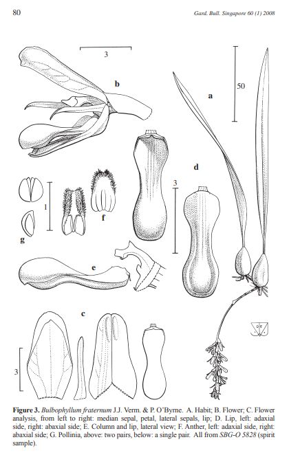 References W3 Tropicos, Kew Monocot list , IPNI ; * Gard. Bull. Singapore 60:79 fig 3 J.J.Verm. & P.O'Byrne 2008 drawing fide; Bulbophyllum of Sulawesi Vermeullen & O'Byrne 2001 photo fide;
