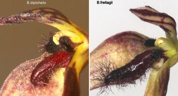 "Bulbophyllum freitagii belogns to the recently described SECTION Hoplandra Verm 2008 and is closely allied with Bulbophyllum diplohelix. Its lateral sepals are much shorter than B. diplohelix and do not spiral around each other; the lip is about twice the size with a lumpy surface. The hairs are much longer, and the ovary and pedicel are shorter." Rudolf Jenny