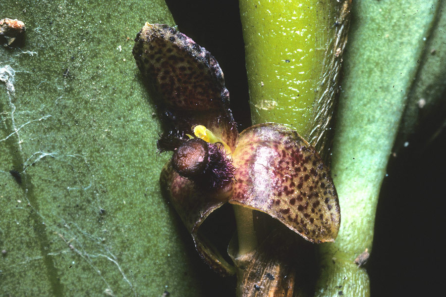 Found in New Guinea in lower range forests on trees and shrubs at elevations around 700 to 800 meters as a small sized, warm growing epiphyte with a hanging usually unbranched rhizome giving rise to laxly spaced, minute, the middle adnate to the stem, cylindrical, terete, glabrous pseudobulbs carrying a single, apical, narrow, obliquely linear-ligulate, subcoriaceous, glabrous leaf that blooms in the late winter through early spring on a short, covered with peduncle-scales, single flowered inflorescence with ovate, acuminate, less than half as long as the shortly pedicellate ovary floral bracts.
