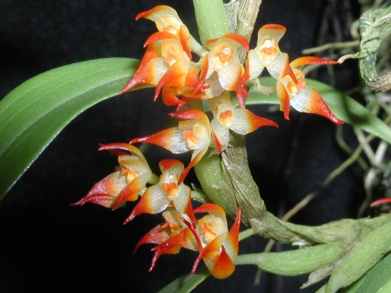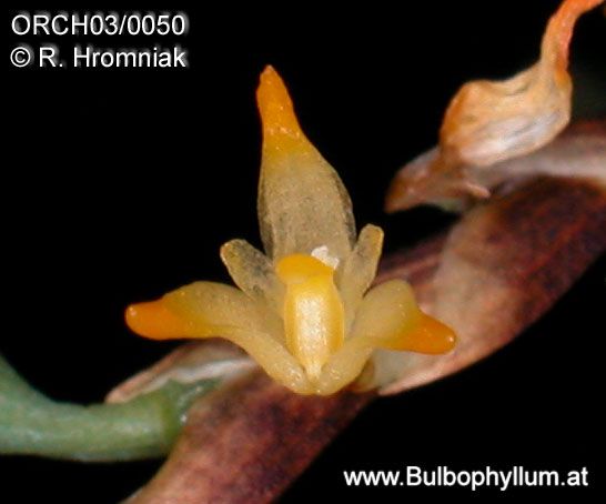 Found in Queensland Australia as a small sized, warm to cool growing epiphyte and occasional lithophyte in cloud or rainforest trees with mossy bark above the elevation of 700 meters with a pendant, branching rhizome enveloped in purple-brown sheaths that also partially cover the almost prostrate pseudobulbs that are about 1/8" apart on the rhizome and carry a single, apical, narrow, succulent leaf that blooms in the winter through spring on a thick, basal, 1/8" [5 mm] racemose inflorescence that has brown, papery sheaths covering the ovary carrying several flowers that is held above the leaves.