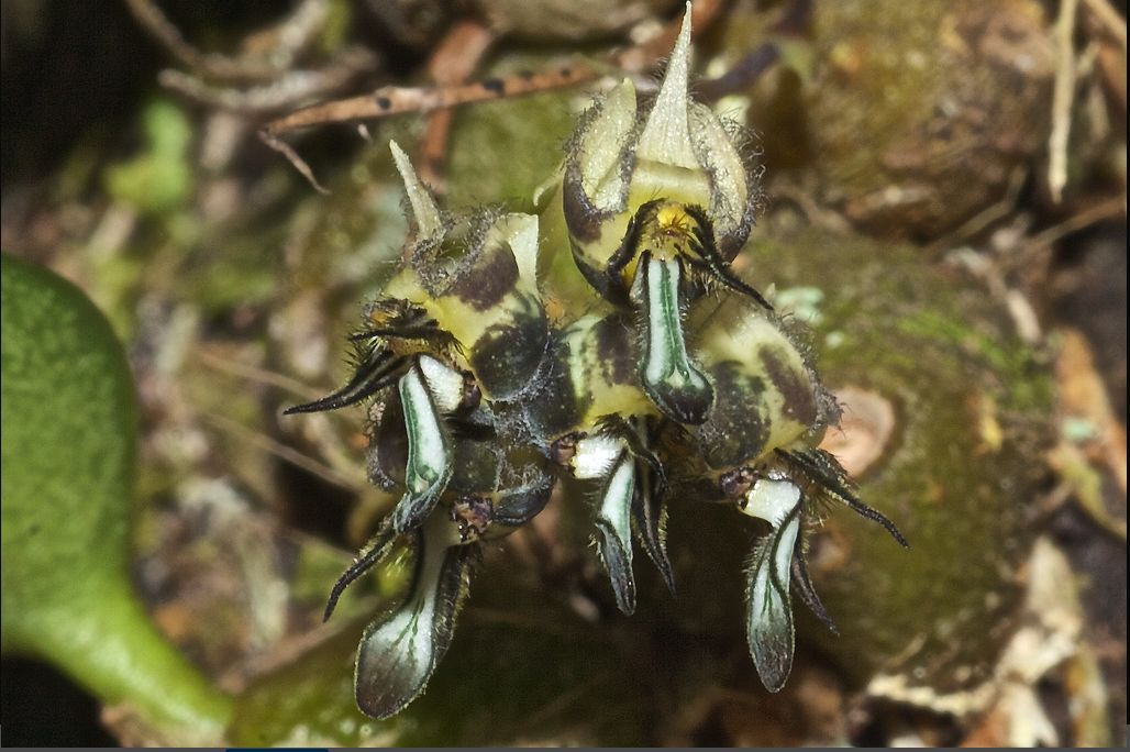 Found in Sabah Borneo in tall forests at elevations around 1100 to 1200 meters as a mini-miniature sized, cool growing epiphyte with close set, ovoid to almost globose pseudobulbs carrying a single, apical, erect, elliptic, rounded to subacute, shortly petiolate base leaf that blooms in the spring on a patent to almost pendulous, peduncle to .6 to 1.2" [1.5 to 3 cm] long, racjhis spindle shaped, porrect to nodding at its base, to .72 to 1.32" [1.7 to 3.3 cm] long overall, simultaneously 4 to 10 flowered inflorescence carrying non-resupinate, spirally arranged flowers.
