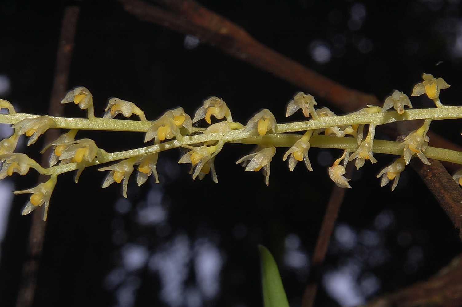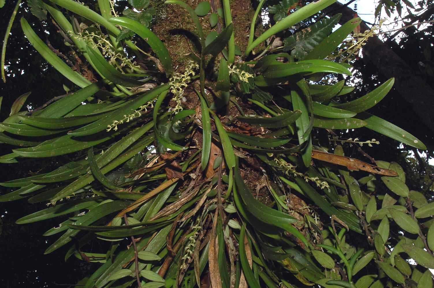 Found in Malaya, Sumatra, Borneo, Java in hill forests at elevations of 800 to 1200 meters as a small sized, hot to warm growing epiphyte with very small, cylindrical pseudobulbs and very long, thick, lanceolate-elliptic, obtuse, basally acuminate, petiolate, medium green leaves and blooms on a basal, erect to gracefully arching, 12" [30 cm] long, racemose, several flowered inflorescence enveloped basally by tubular, acuminate sheaths and carrying freshly fragrant, wide open, cream colored flowers occuring in the summer and fall.