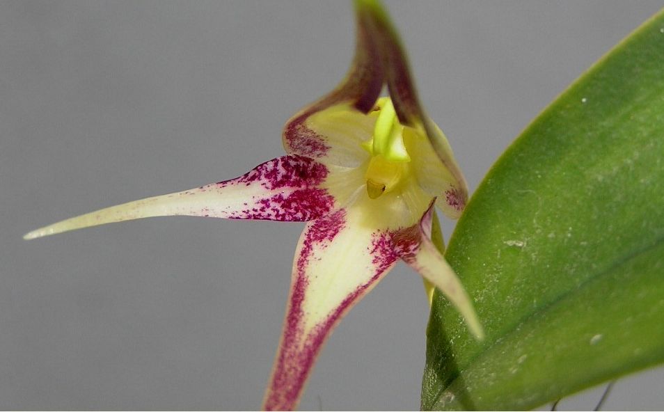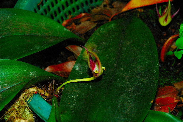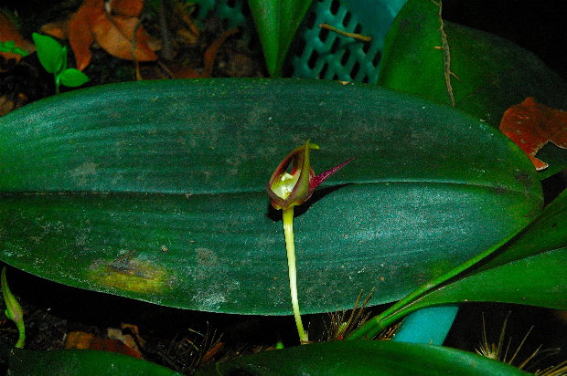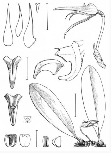 Found in Papua New Guinea in lowland forests at elevations of 60 to 160 meters as a miniature to small sized, hot growing epiphyte with a rhizome with persistent bracts, .4 to 1.6" [1 to 4 cm] between each ovoid pseudobulb carrying a single, apical, erect, elliptic to obovate, rounded to obtuse apically, petiolate base leaf that blooms at most any time of the year on from the rhizome, 1.6" [4 cm] long, single flowered inflorescence.