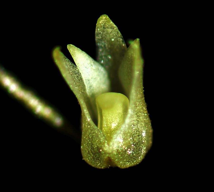 Found in Queensland and New South Wales Australia at elevations of 100 to 900 meters in rainforests on larger branches and upper trunks of Hoop Pine as a mini-miniature sized, hot to warm growing epiphyte from with tiny, globose, pale green to reddish pseudobulbs and a single, apical, short, linear-subulate leaf a slender, petite, 3/8" [1 to 1.5 cm] long, single flowered inflorescence occuring in the spring holding the flower well above the leaves.