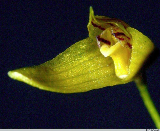 Found in western New Guinea in lower montane forests at elevations around 750 meters as a mini-miniature sized, warm growing epiphyte with a slender, branched rhizome covered with lanceolate, acuminate, falling off bracts and giving rise to close together, ascending, cylindrical, base dilated pseudobulbs carrying a single, apical, erect, grass-like, linear, flaccid, obtuse leaf that blooms on a filiform, .8 to 1" [2 to 2.5 cm] long, single flowered inflorescence with funnel-shaped, blade lanceolate, elongate, shorter than the ovary floral bracts.