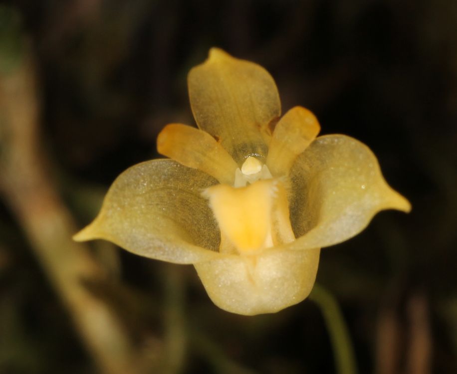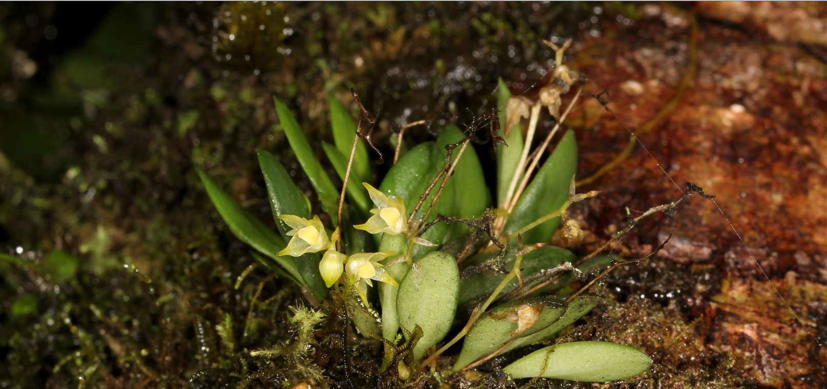 Found in Sarawak and Sabah Borneo in ridge top and low and open forests at elevations around 500 to 2000 meters as a mini-miniature to miniature sized, warm to cool growing epiphyte with .12 to .6" [.3 to 1.5 cm] between each minute spheroid to discoid, not laterally flattened pseudobulb carrying a single, apical, erect, elliptic, obtuse to acute, narrowing below into the petiolate base leaf that blooms in the spring with the mini-miniature sized orchid an erect to patent, 1 to 2" [2.5 to 5 cm] long, single flowered inflorescence or on the miniature sized orchid a more elongate 2 flowered inflorescence.