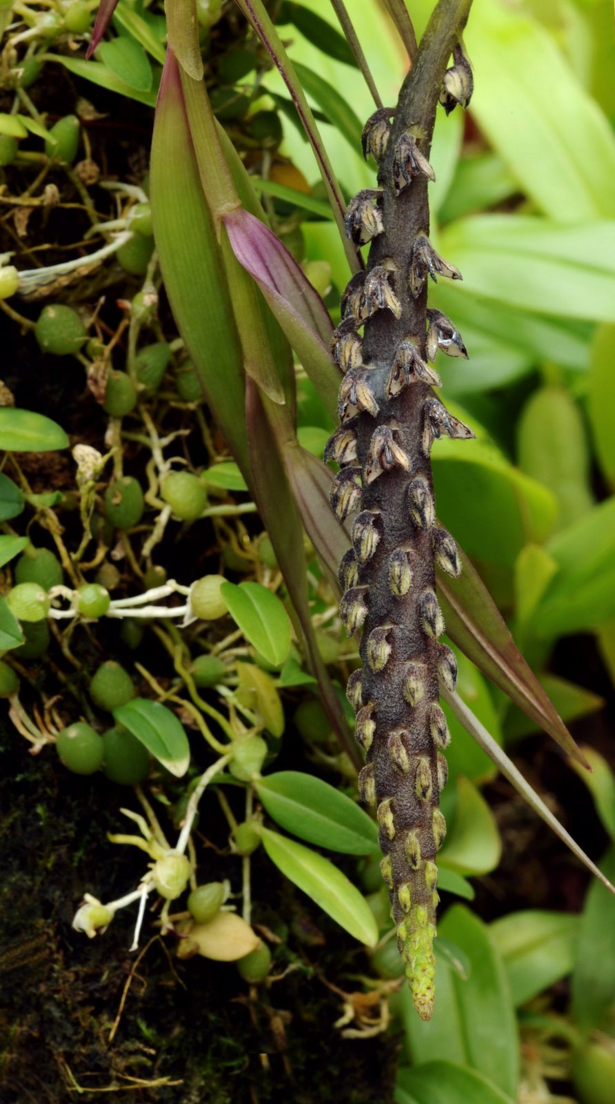 Found in Sarawak Borneo on limestone hills in forests at elevations of sealevel to 250 meters as a small sized, hot growing epiphyte with .16 to .4" [.4 to 1 cm] between each ovoid pseudobulb carrying a single, apical, erect, elliptic-oblong, rounded, petioalte base leaf that blooms on an erect to patent, elongated, 7 to 13.8" [17.5 to 23.5 cm] long, spindle-shaped, rather dense, successively several, 45 to 65 flowered inflorescence with triangular, cuspidate, shorter than the ovary floral bracts.