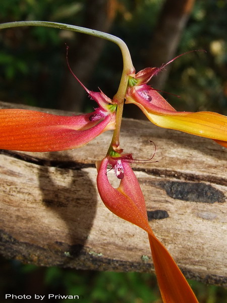 Please refer to B dickasonii as well. There is confusion as to which is which or if they are both the same and the does the antennae at the apex of the dorsal sepal develop as the flower ages? I have no references to confirm and got all information from a Thai Blog and that is not my language.