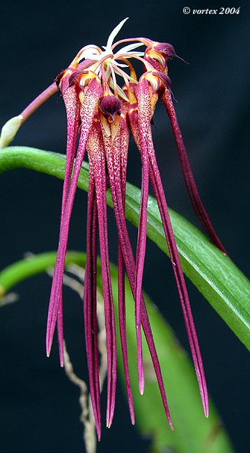 Found in Borneo in lower montane forests at elevations of 600 to 800 to 1500 meters as a miniature to small sized, warm to cool growing epiphyte with .4 to 1" [1 to 2.5 cm] between each somewhat flattened to not, ovoid pseudobulb carrying a single apical, erect, elliptic, obtuse, petiolate base leaf that blooms in the late winter and early spring on a basal, 1.8 to 3.6" [4.5 to 9 cm] long, simultaneously opening, 6 to 9 flowered inflorescence with ovate, acute floral bracts.