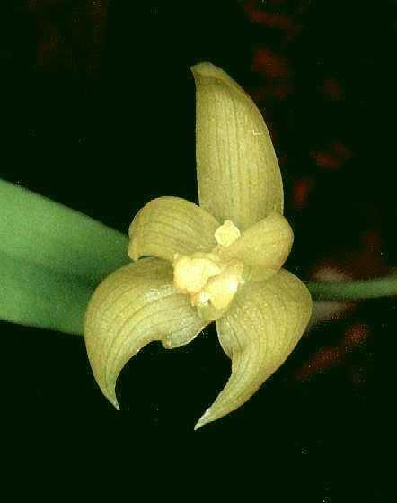 Found in Java as a miniature to small sized, hot to cool growing epiphyte with a creeping and very branched rhizome with .6" [1.5 cm] between each conical, green in youth, becoming yellow with age pseudobulbs carrying a single apical, lanceolate, acute, petiolate leaf that is dark green above and lighter below that blooms in the summer and fall on a short to 2" to 2.4" [5 to 6 cm] long, single flowered inflorescence that has strongly fragrant, musky scented flowers.