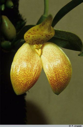 Found in New Guinea in lower montane forests at elevations around 750 meters as a small sized, warm growing epiphyte with a short rhizome giving rise to close set, ovoid, cylindrical pseudobulbs in youth surrounded by a pale brown, scarious sheath carrying a single, apical, dark green, paler green beneath, narrowly oblong-elliptic, obtuse, acuminate, petiolate base leaf that blooms on a porrect, .16" [.4 cm] long, single flowered inflorescence with amplexicaul, ovate, acute, scarious floral bracts and carrying slightly sweet smelling flowers with a creamy-white median sepal, inside faintly spotted maroon, creamy-white lateral sepals with the base maroon blotched, the apex with maroon spots. whitish petals, without spots, a creamy-white lip with the inner surface irregularly marked with maroon, paler towards the apexand a white anther.