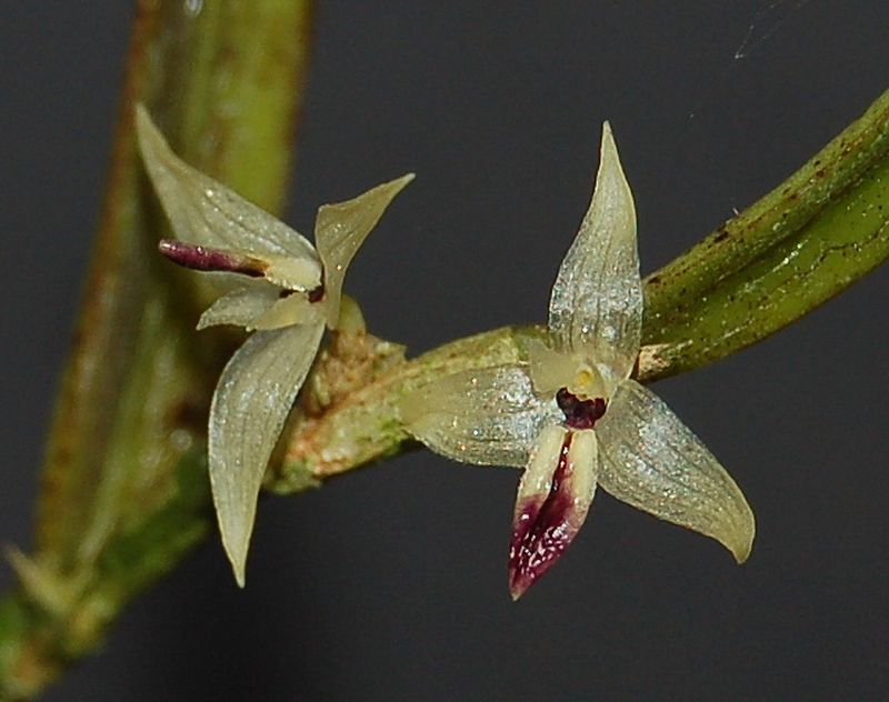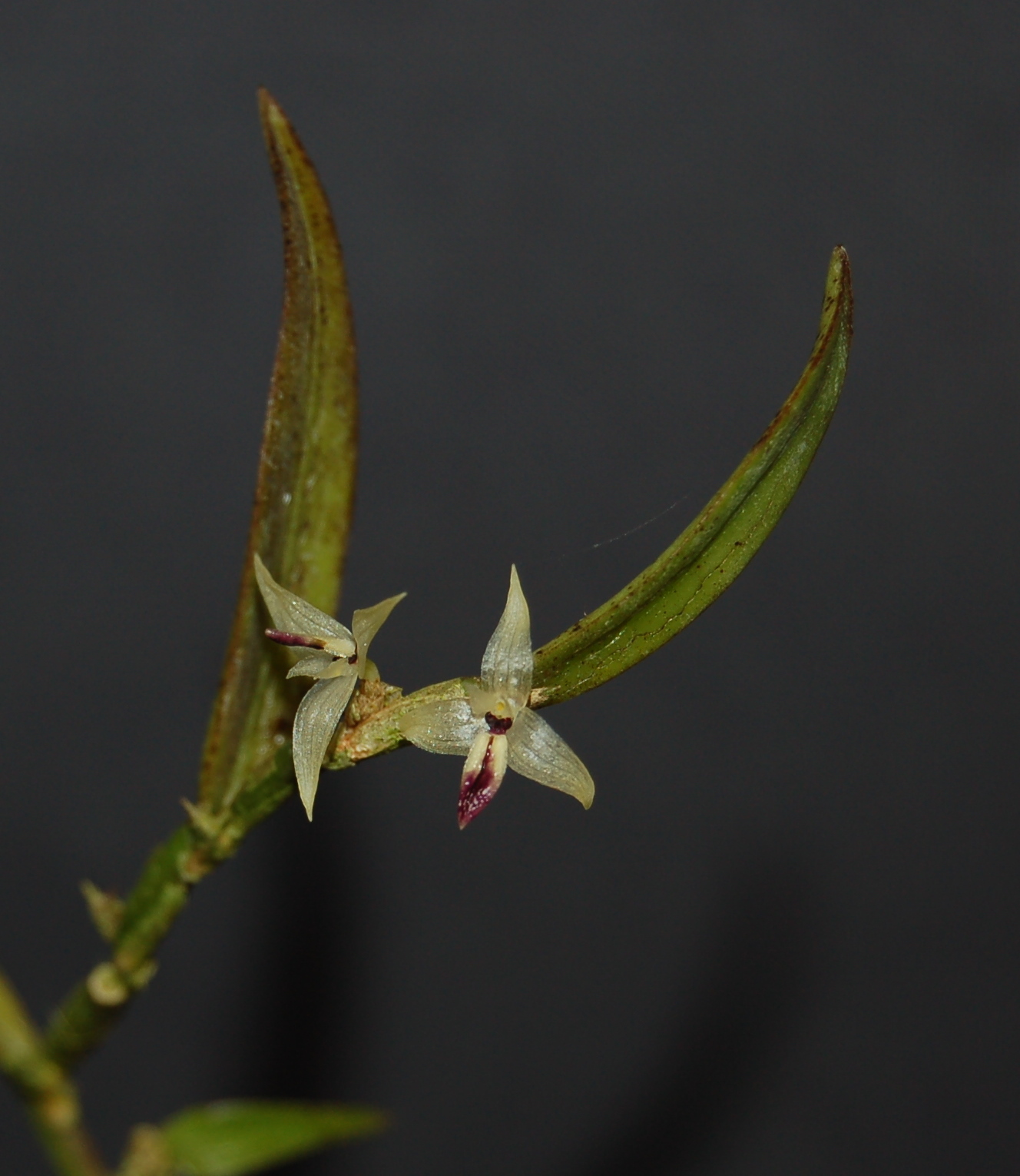 Found in New Guinea in lowland forest and coastal swamp forests at elevations of sea levewl to 400 meters as a small sized, hot growing epiphyte with a creeping rhizome giving rise to superposed, connate to the rhizome, subterete pseduobulbs carrying a single, apical, erect, fleshy linear to linear-ligulate, acute to apiculate, shortly contracted and narrows below into the base leaf that blooms in the fall on a very short, .15" [.4 cm] long, subte4nded by basal sheaths, single flowered inflorescence