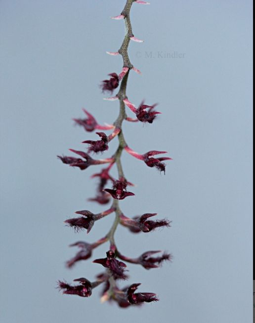 Found in Madagascar in seasonally dry, deciduous forests at elevations of sealevel to 600 meters as a mini-miniature sized, hot to warm growing epiphyte with 1.2 to 1.6" [3 to 4 cm] between each 4 angled, yellow pseudobulb carrying 2, apical, lanceolate to oblong-ligulate leaves that blooms in the late fall through spring on a basal, erect, thin, rachis fractiflex, to 6" [15 cm] long, to 6.8” [17 cm] long overall, densely many flowered inflorescence.