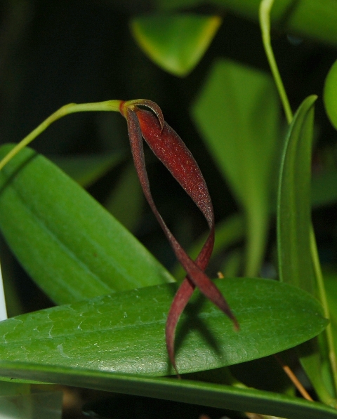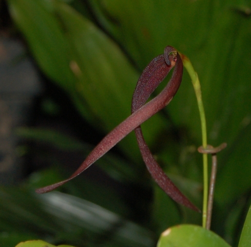 Found in Papua New Guinea without locality as a mini-miniature sized, warm to cool growing epiphyte with .2 to .36" [.5 to .9 cm] between each conspicuous, erect, ellipsoid-cylindrical to ovoid-cylindrical, not angular pseudobulb carrying a single, apical, erect, elliptic, rounded, shortly petiolate base leaf that blooms on an erect,peduncle to 3" [to 7.5 cm] long, 5.6" [14 cm] long overall, single flowered inflorescence with about 4 scales.