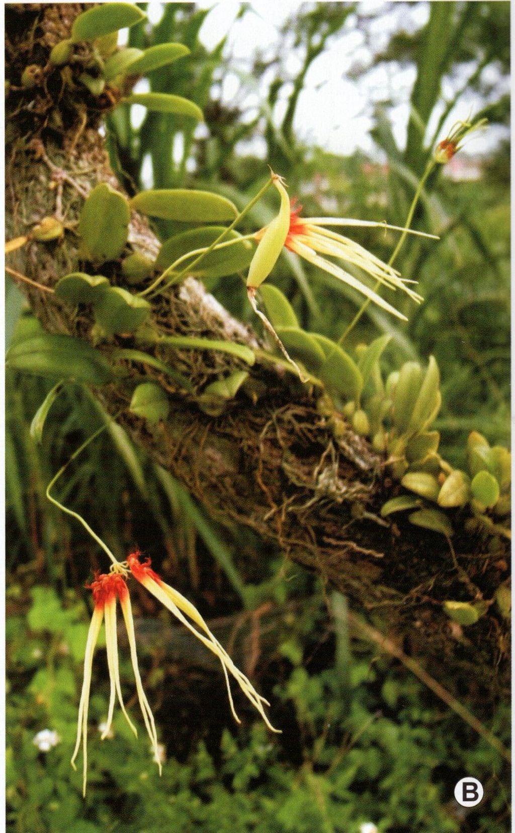 Found in Vietnam and Taiwan on tree trunks in forests at elevations around 500 to 3000 meters as a miniature sized, warm to cold growing epiphytic species with small, grooved, ovate pseudobulbs carrying a single, apical elliptic to elongate-elliptic, coriaceous, subacute, narrowing below into the shortly petiolate base leaf that blooms in the summer on a basal, 2 3/8" [6 cm] long, slender inflorescence that has an apical umbel of several [4 to 10] flowers.