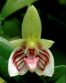 Found in Papua New Guinea in primary forest, usually near the forest floor at elevations of 850 to 1000 meters as a mini-miniature to miniature sized, warm growing epiphyte with a creeping rhizome with 1 to 6" [2.5 to 15 cm] between each cylindrical, hardly flattened pseudobulbs carrying a single apical, erect, coriaceous, ovate to elliptic, acuminate apically leaf that blooms in the spring usually on a single, basal, 2 to 3.2" [5 to 8 cm] long, peduncle with 3 to 4 bracts, rachis .6" [ 1.5 cm] single flowered inflorescence with tubular, apically acuminate. shorter than the ovary floral bracts.