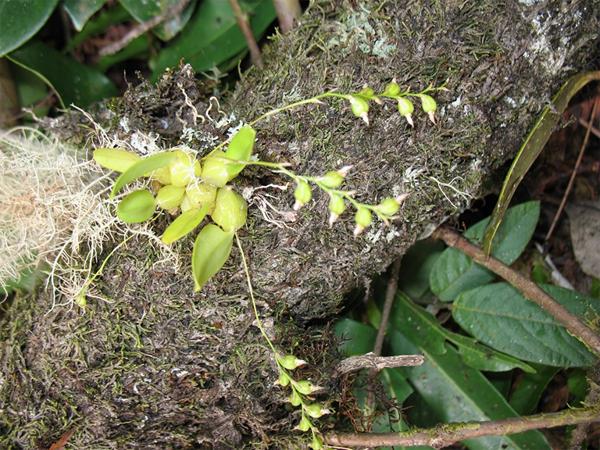 Found in Madagascar in humid evergreen forests at elevations of 400 to 1200 meters as a mini-miniature sized, hot to cool growing epiphyte with compressed, short, ovoid to subglobose pseudobulbs carrying a single, apical, oblong to lingulate-oblong, shortly contracted below into the base leaf that blooms in the summer through fall on a basal, erect, very thin, peduncle provided with a few sheaths, 1.4” [3.5 cm] long, rachis 1.8” [4.5 cm] long, flexous, 2 to 3.2" [5 to 8cm] long, 8 to 15 flowered inflorescence with thin, oval-apiculate, longer than the pedicel floral bracts and carrying live white flowers becoming hyaline when dried.