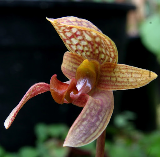 Found in Borneo and Sulawesi in low and open forests in karst sinkholes and in grasslands as well as in primary forests at elevations of 1100 to 1400 meters as a small sized, warm growing epiphyte with 1.2 to 3.6” [3 to 9 cm] between each distinct, ovoid pseudobulb carrying a single, apical, erect, elliptic to obovate, obtuse to subacute, gradually narrowing below into the .8 to 2” [2 to 5 cm] long, petiolate base leaf that blooms in the spring on a basal, 2.4 to 6.4” [6 to 16 cm] long, single flowered inflorescence with an acute floral bract.