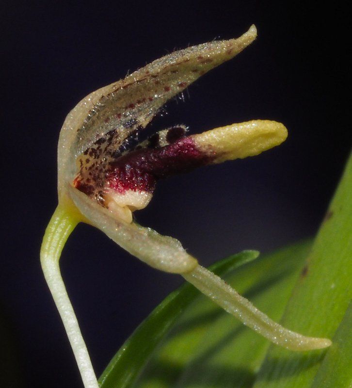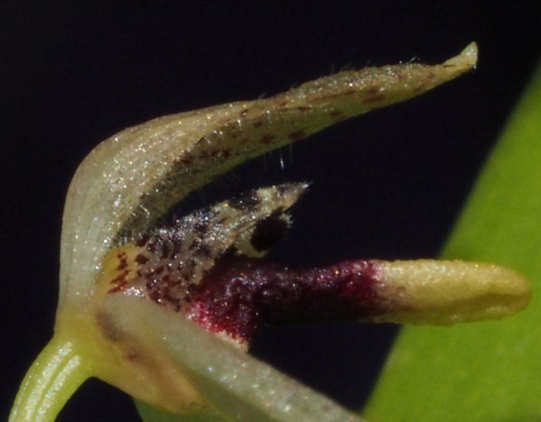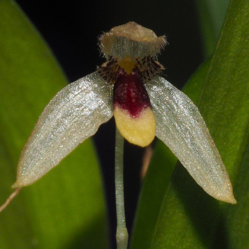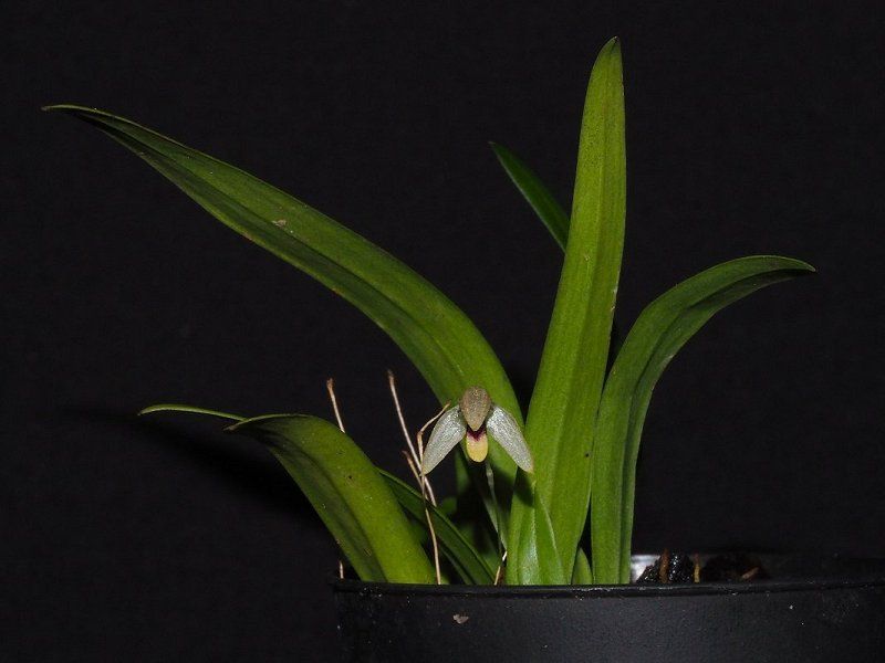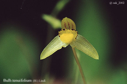 Found in western Java in humid areas at elevations of 1000 to 1200 meters as a miniature sized, warm growing epiphyte with close set, long-ovoid, furrowed pseudobulbs carrying a single, apical, erect, coriaceous, lanceolate, rather obtuse, leaf that blooms on a basal, erect, shorter than the leaf, to 1.2" [3 cm], single flowered inflorescence