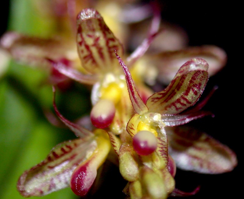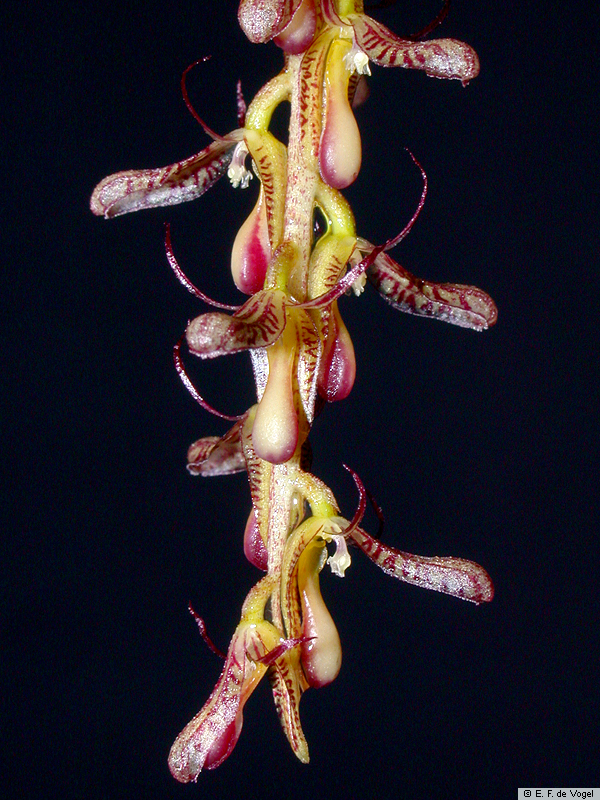 Found in Sulawesi in wet disturbed, montane forests at elevations of 1600 to 2500 meters as a small sized, creeping to straggling, cool to cold growing epiphyte with .28 to .8" [.7 to 2 cm] between each distinct, ovoid, not angular pseudobulb carrying a single, apical, erect, coriaceous, obovate-elliptic, acute, gradually narrowing below into the .28 to 1.12” [.7 to 2.8 cm]long, petiolate base leaf that blooms on a basally nodding, limply pendulous, not thickened, rather dense, racemose, 5 to 12” [12.5 to 30 cm] long, 10 to 17 flowered inflorescence with acute floral bracts.