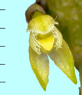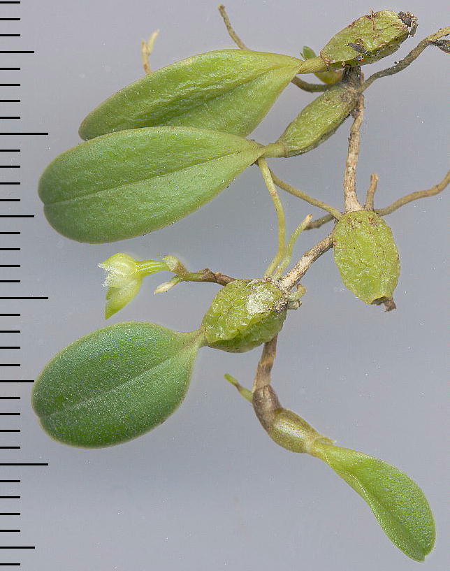Found in Japan, the Ryukyus and Korea as a mini-miniature sized, cool to cold growing epiphyte with distant, ovoid, small pseudobulbs carrying a single, apical, fleshy, oblong-elliptic to elliptic-oblanceolate, often caniculate, obtuse to rounded, tapering to a short, petiolate base leaf and blooms on a short, basal, to .4" [1 cm] long, single flowered inflorescence that is held close to the pseudobulb and below the leaves.