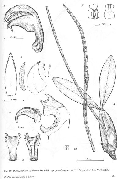 References W3 Tropicos, Kew Monocot list , IPNI ; Orchid Monographs Vol 3 Vermeullen 1987 drawing fide; Orchid Monographs Vol 3 Vermeullen 1987 as B injoloense ssp pseudoxypterum drawing fide; Flora Zambesiaca Vol 11 Orchidaceae Part 1 Pope 1995 as Bulbophyllum injoloense subsp. pseudoxypterum