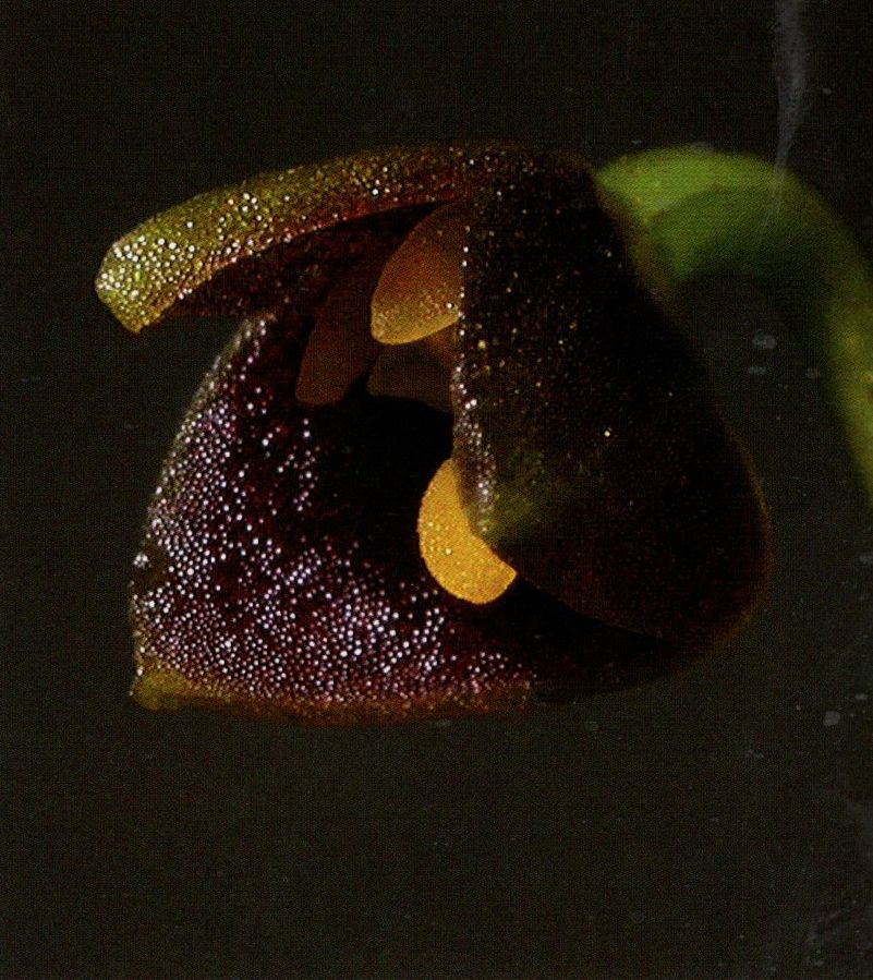 Found in Sulawesi in secondary forest near streams elevations around 1450 meters as a mini-miniature sized, cool growing epiphyte with a creeping rhizome with .12 to .2" [.3 to .5 cm] between each, ellipsoid to ovoid pseudobulbs carrying a single, apical, erect, elliptic to ovate, acute, narrowing below into the petiolate base leaf that blooms in the fall and winter on a patent, peduncle .6 to .68" [1.5 to 1.7 cm] long, provided with 3 bracts, the longest ca .14" [3.5 mm] long, raceme .88 to 1.4" [2.2 to 3.5 cm] long overall, single flowered inflorescence with a tubular, acute, shorter than the ovary floral bract and carrying flowers that hardly open with whitish sepals, stained with pale pinkish red, yellowish towards the tip.