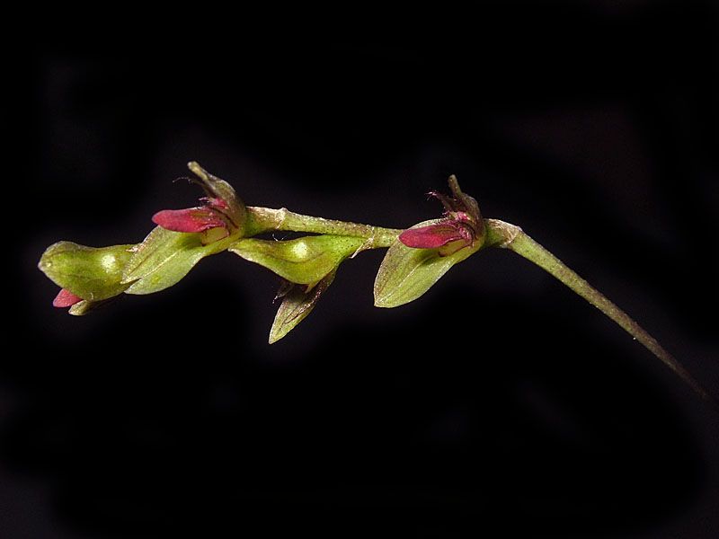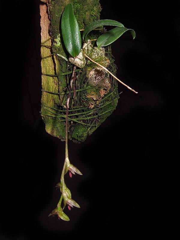 Found in Jamaica in open rocky woodsat elevations around 150 to 900 meters as a miniature sized, hot to warm growing epiphyte with clustered, globose, wrinkled pseudobulbs carrying a single apical, ovate-lanceolate, dark green, leathery leaf that blooms in the winter through summer on a basal, 3.6" [9 cm] long, arching to pendant, racemose, 3 to 10 flowered inflorescence