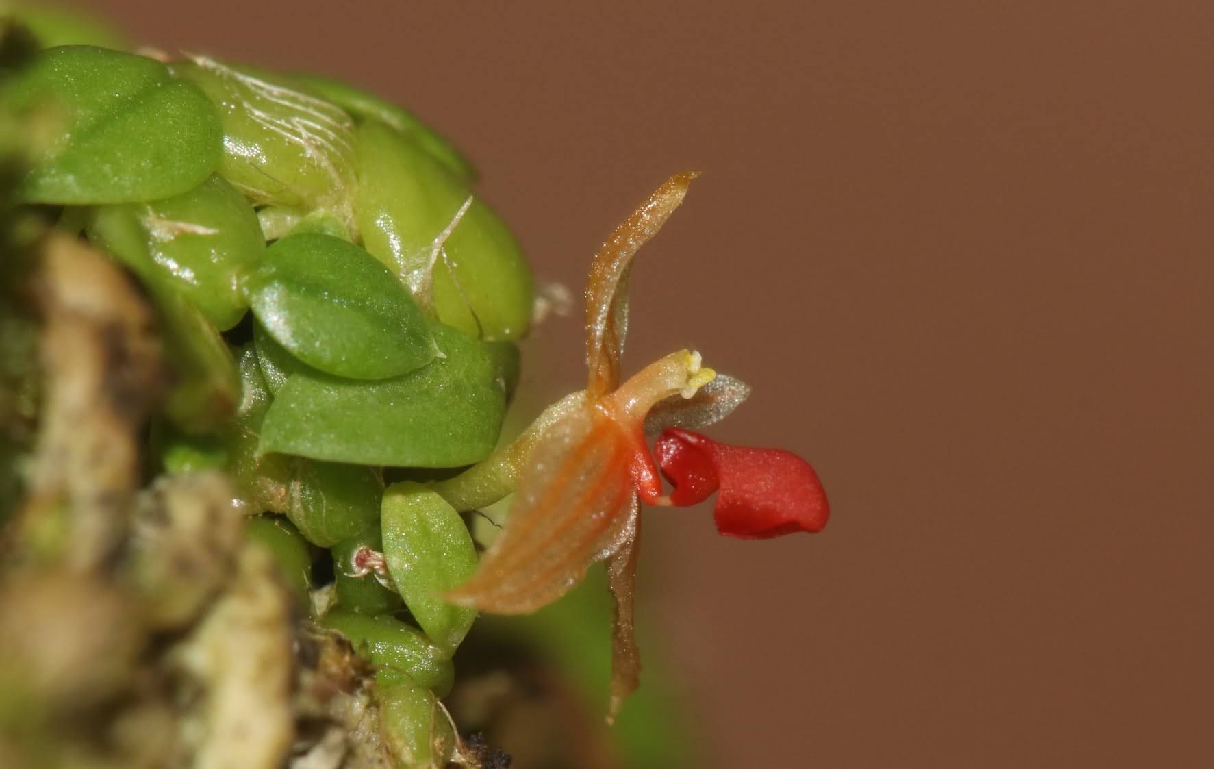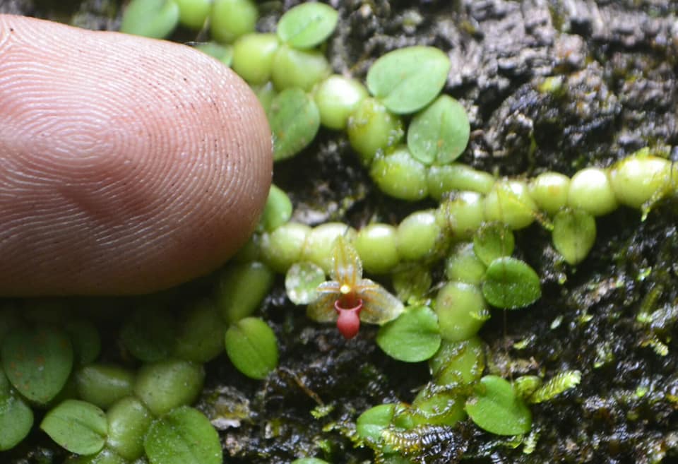Found in Brunei Borneo and Sumatra in primary forests at elevations around 200 to 300 meters as a mini-miniature sized, hot growing epiphyte with a creeping rhizome giving rise to close set, ovoid to ellipsoid to orbicular, flattened pseudobulbs carrying a single, apical, erect, ovate to elliptic, acuminate, petiolate base leaf that blooms on an erect to patent, peduncle .12" [.3 cm] long, 2 bracted, .28" [.7 cm] long overall, single flowered inflorescence with longer than the ovary floral bracts.