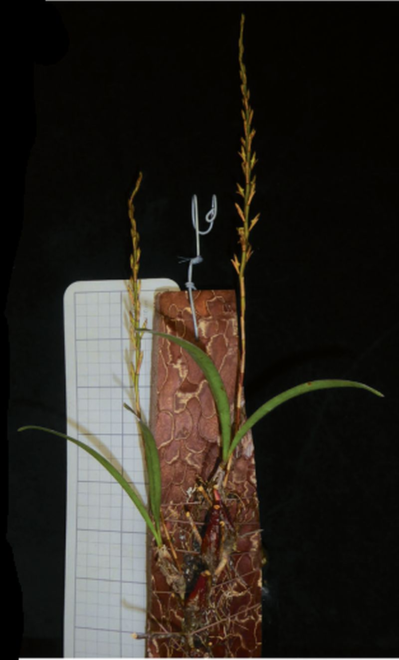 Found in Madagascar in high elevation forest remnants and evergreen humid forests at elevations of 900 to 1700 meters as a small sized, warm to cool growing epiphyte with a short ascending rhizome with .4 to 1.2" [1 to 3 cm] between each conical longitudinally deeply grooved, apically rounded, yellowish gree, olive green to reddish orange pseudobulbs carrying 2, apical, erect speading, ligulate to narrowly oblong, slightly emarginate, pale green to olive green, contacted below into the base leaves that blooms in the spring and summer on an erect, rigid, peduncle [7 to 18 cm] long, provided with 2 to 4 tubular, sheaths, rachis thickened, subdensely racemose, 5.6 ro 11.2" [14 to 28 cm] long, successively 1 to 4, to 30 flowered inflorescence with lanceolate attenuate, verrucose on the exterior, greenishbrown, dark red at the very base, longer than the pedicel and ovary. floral bracts