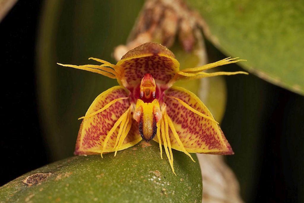 Found in the Philippines on Mindanao Island on mossy trees at elevations around 1300 meters as a miniature sized, cool growing epiphyte with cylindrical, pendulous rhizome enveloped completely by dried cataphyls with .48” [1.2 cm] between each, clustered, four angled, slightly flattened, oblong-ovate, dessicated, brown with a purplish tinge pseudobulbs carrying a single, apical, ovate to oblong, involute edges, appearing tubular, distinctly grooved above, obtuse, leathery, dark green beneath, purplish brown above leaf that blooms in the winter on a basal, peduncle short, .4” [1 cm] long, provided with 2 tubular sheaths, successively single, few flowered inflorescence.