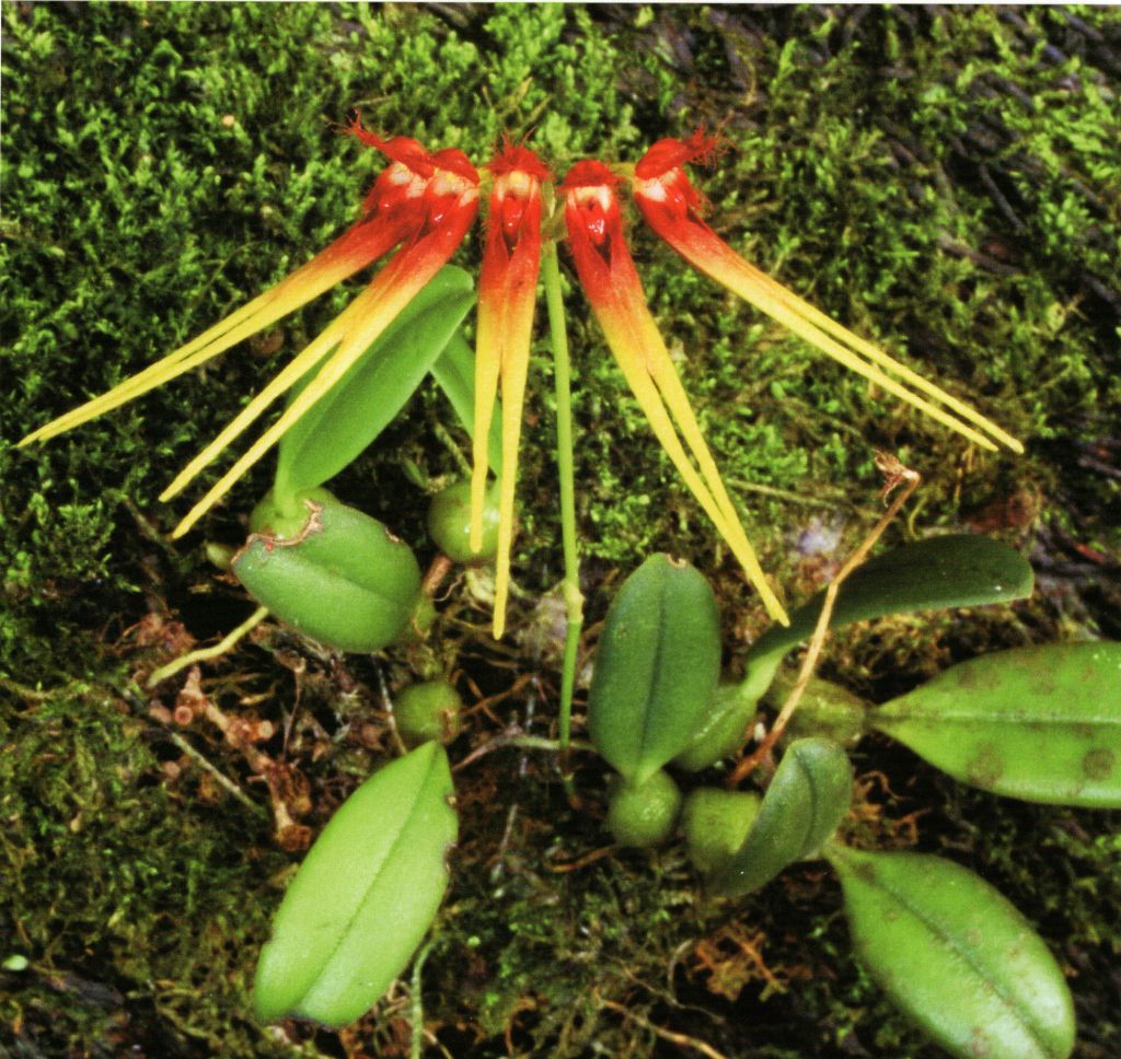 Found in Taiwan at elevations of 200 to 900 meters as a miniature sized, hot to warm growing epiphytic species with small, grooved, ovate pseudobulbs carrying a single, apical elliptic to elongate-elliptic, coriaceous, subacute, narrowing below into the shortly petiolate base leaf that blooms in the spring on a basal, 2 3/8" [6 cm] long, slender inflorescence that has an apical umbel of several [4 to 10] flowers.